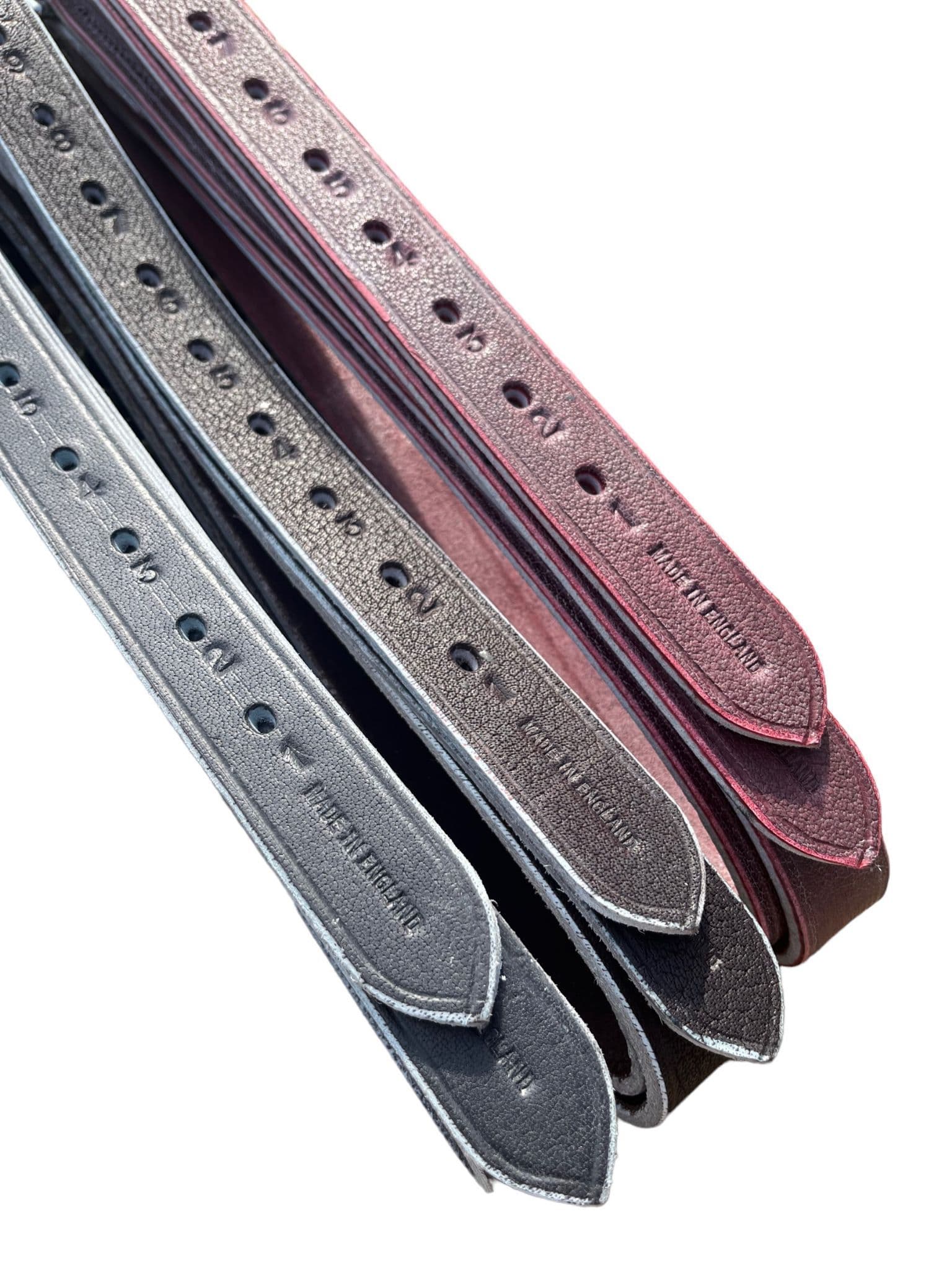 English Handmade in our workshop in Cirencester are these Buffalo strirrup leathers. Made from strong pre-stretched buffalo hide, the leathers are extremely strong and durable. Finished with stainless steel buckles. Available in Brown, Black and Red.
