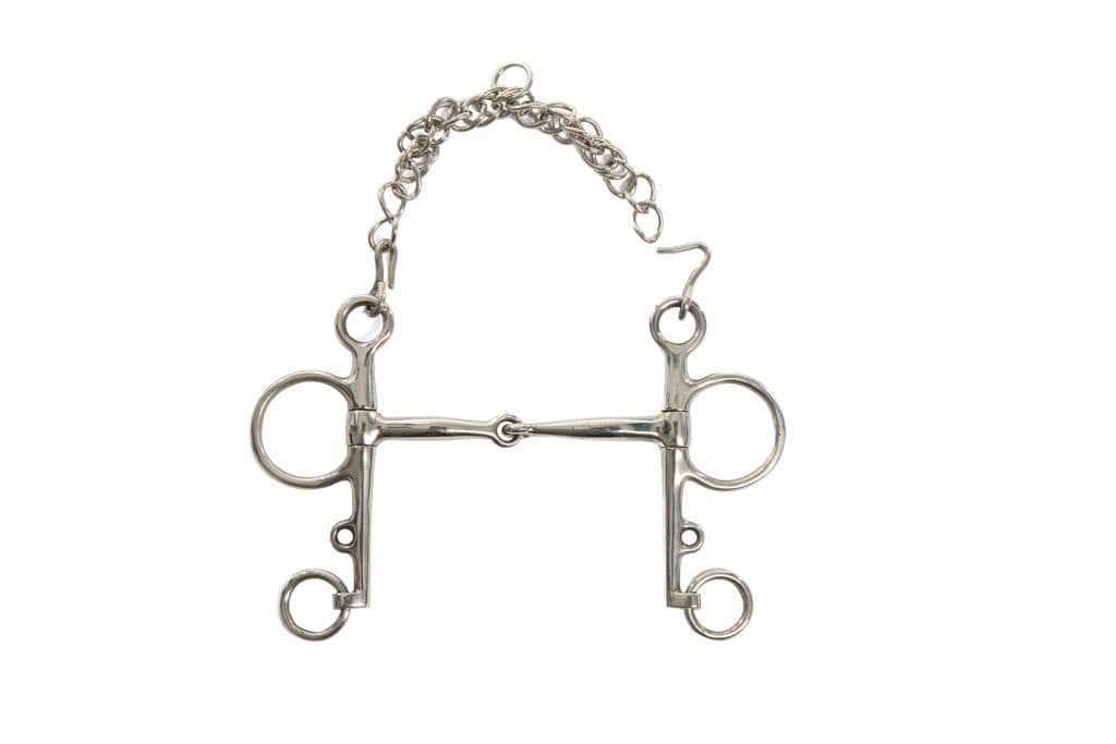 The Pelham bit is often used for horses that prove to strong in a snaffle, the Pelham is a very popular bit. It uses a variety of pressures, which all in all seem to work together to prove a very useful bit. Basically the Pelham is an incorporation of the Weymouth and bradoon, and should theoretically be used with 2 reins, the first rein is attached to the snaffle rein, and the second rein attached to the ring at the bottom of the shank, when the first rein is used the Pelham acts like a hanging cheek snaffle, putting slight pressure on the poll and carious pressures in the mouth depending on the mouthpiece, when the second rein is brought into play, this increases the leverage and lip pressure, and also the curb chain comes into play, the greater the distance between the cheek slot and the mouthpiece the greater the poll pressure, the greater the length of shank the greater the amount of leverage. The curb chain should be fitted so that the curb chain tightens when the second rein is brought into play, but there must be a bit of give so not to tighten up straight away.